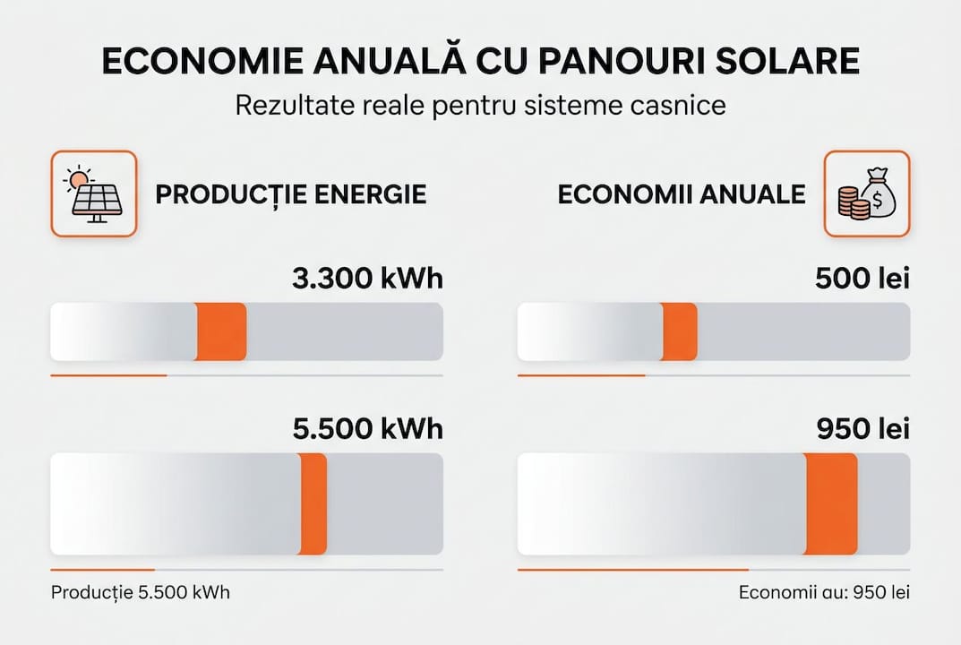 Un sistem de 5 kWp cu baterie de 10 kWh produce în medie 5.500 până la 6.500 kWh pe an în România, în funcție de locație și orientare. Pentru o gospodărie cu consum mediu de 300 kWh pe lună, aceasta înseamnă acoperirea a 60 până la 80% din necesarul anual de energie.
