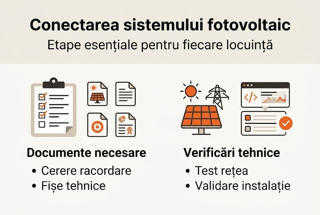 Pentru a nu avea surprize pe parcurs, trebuie să te pregătești temeinic. Procesul de racordare a unui sistem fotovoltaic la rețeaua națională nu este complicat dacă știi exact ce documente sunt necesare și ce verificări tehnice trebuie efectuate înainte de a depune dosarul.