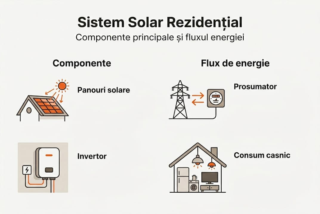 Un sistem fotovoltaic rezidențial are câteva componente esențiale: panourile solare, invertorul și contorul de prosumator. Panourile captează radiația solară și generează curent continuu (DC). Invertorul transformă acest curent în curent alternativ (AC), pe care îl folosesc toate aparatele din casă. Consumul propriu are întotdeauna prioritate. Surplusul de energie produs peste necesarul momentan este injectat în rețeaua națională, iar tu ești compensat pentru aceasta în calitate de prosumator.