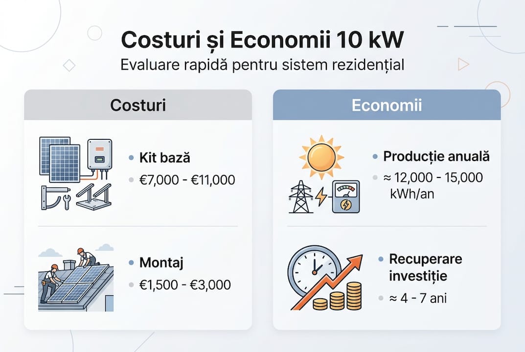 | Amortizare rapidă | Investiția într-un kit de 10 kW se recuperează în mod realist în 4-7 ani cu suport din subvenții și autoconsum crescut. |
