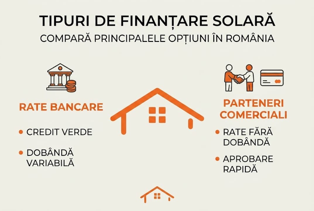 - Tipuri de finanțare: credite verzi, rate bancare și parteneri comerciali