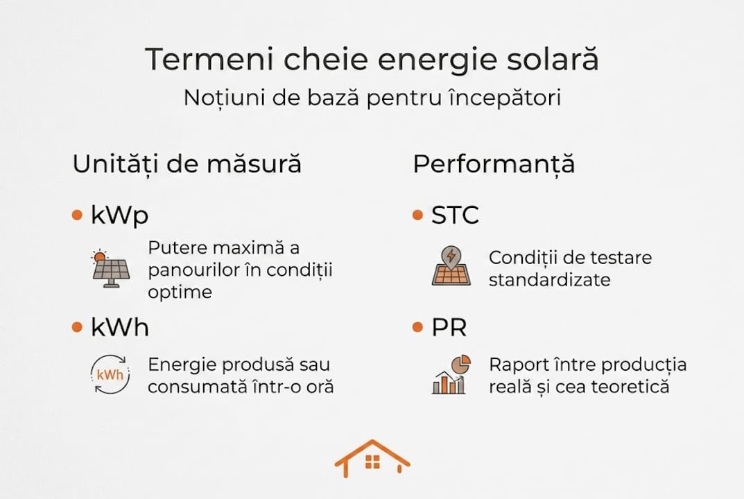 Un sistem solar de 10 kWp poate produce între 12.000 și 16.500 kWh pe an în România, suficient pentru a acoperi consumul anual al mai multor gospodării. Totuși, mulți proprietari care ar vrea să investească în panouri fotovoltaice se opresc în loc când întâlnesc termeni ca kWp, PR, STC sau TOPCon. Limbajul tehnic poate părea un obstacol real. Acest ghid îți explică, fără complicații, cei mai importanți termeni din energia solară, astfel încât să poți lua o decizie informată și să știi exact ce să ceri atunci când soliciți o ofertă.